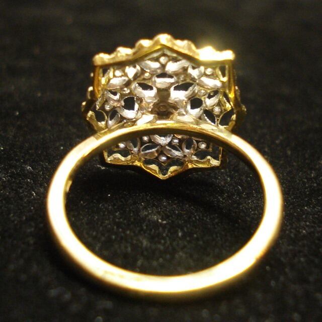 ダイヤとK18イエローゴールド&ホワイトゴールドのコンビ透かしリングで中央にクロスを配しています