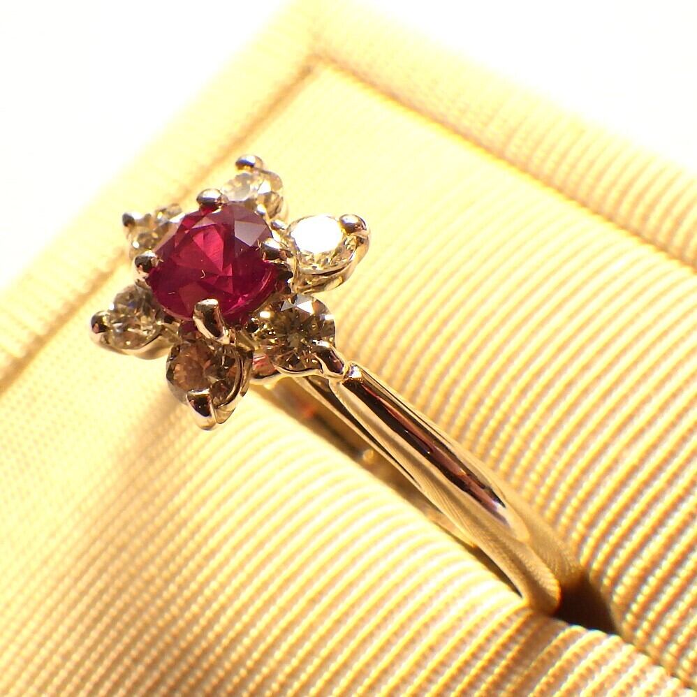 PT台にルビーとアクセントにメレーダイヤモンドをあしらったリングです。バターカップ(キンポウゲ)の花をイメージしたデザインです。