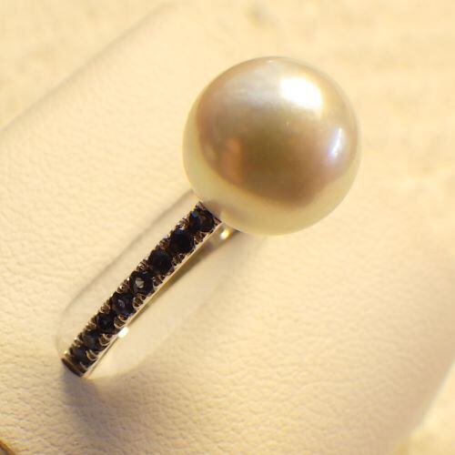 PT900台に9.2mmのアコヤパール、腕にメレーサファイアをあしらったリングです。